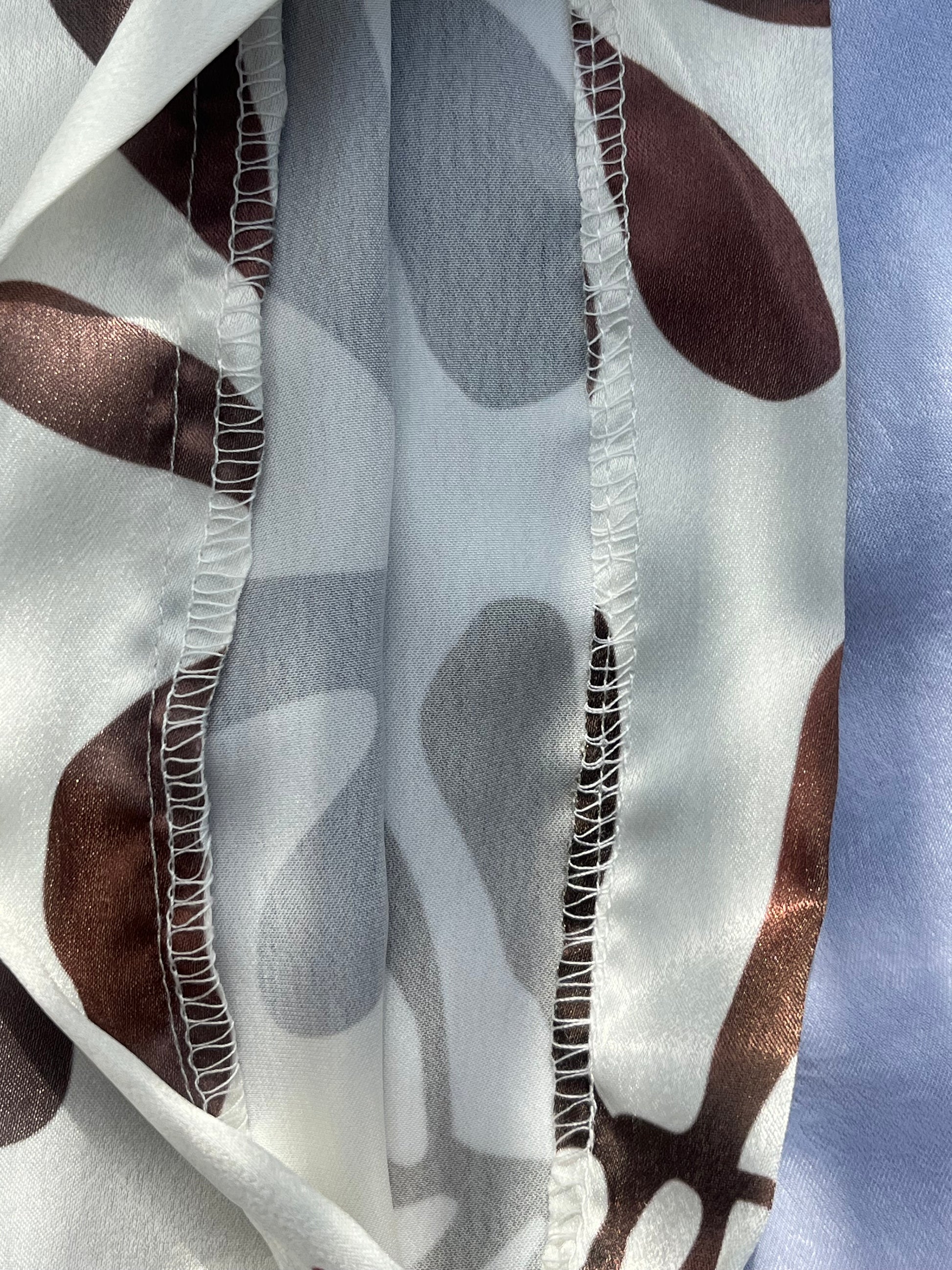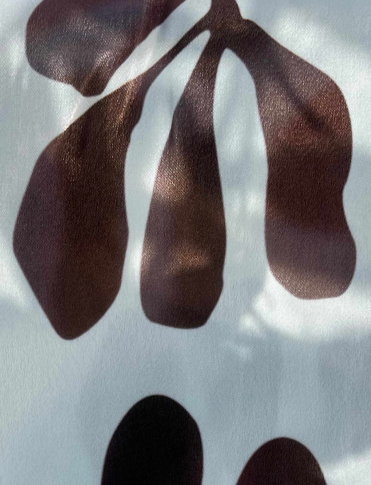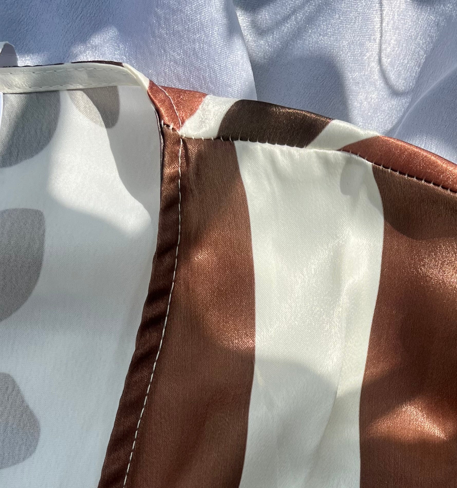 Entre blouse et kimono, il se croise devant façon cache-cœur et sublime instantanément la silhouette. Son satin aux motifs marrons attire le regard avec subtilité.