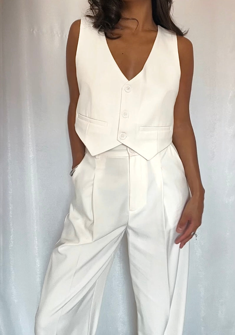 Minimaliste et chic, ce gilet blanc complète parfaitement ton tailleur.
