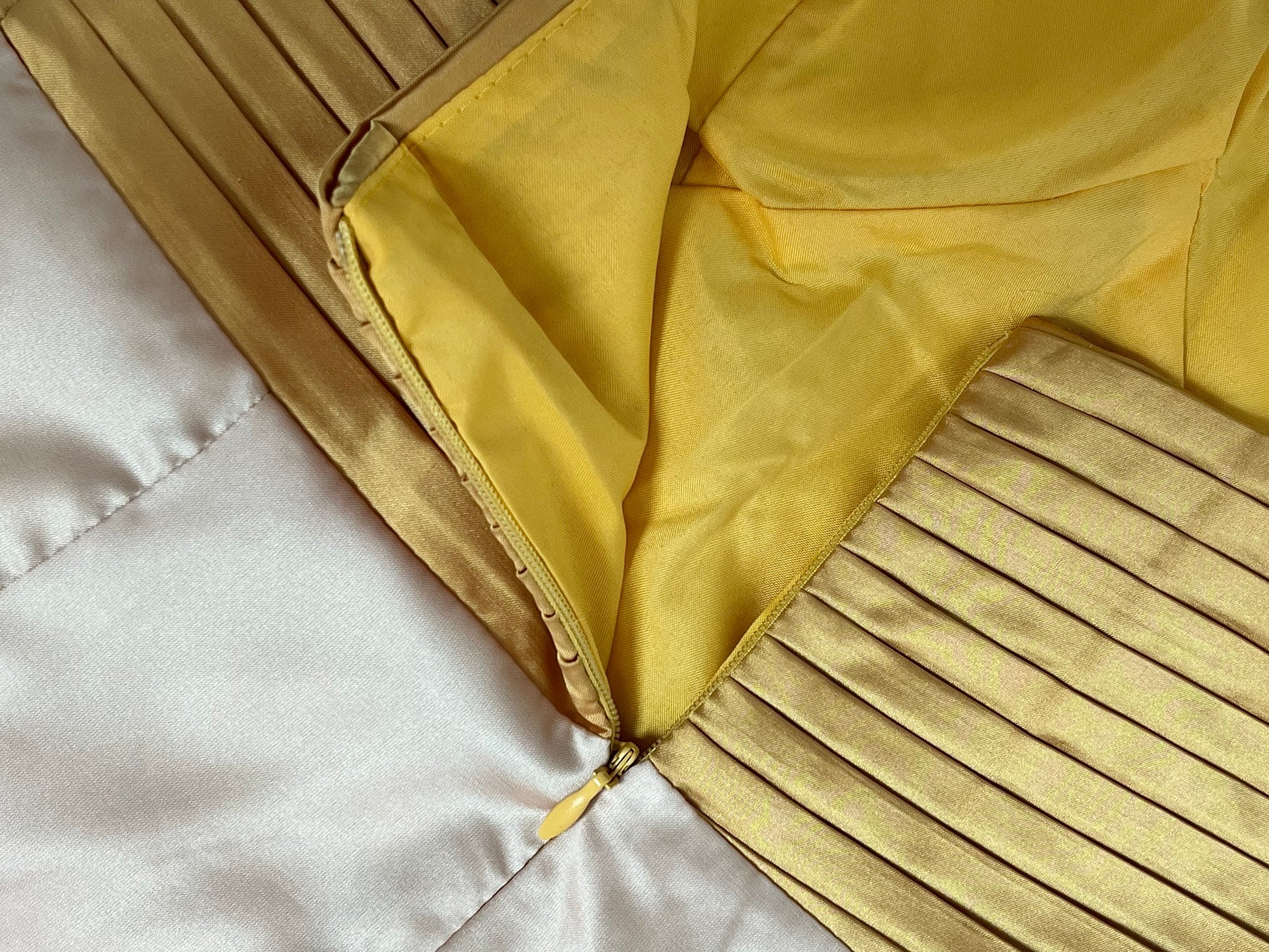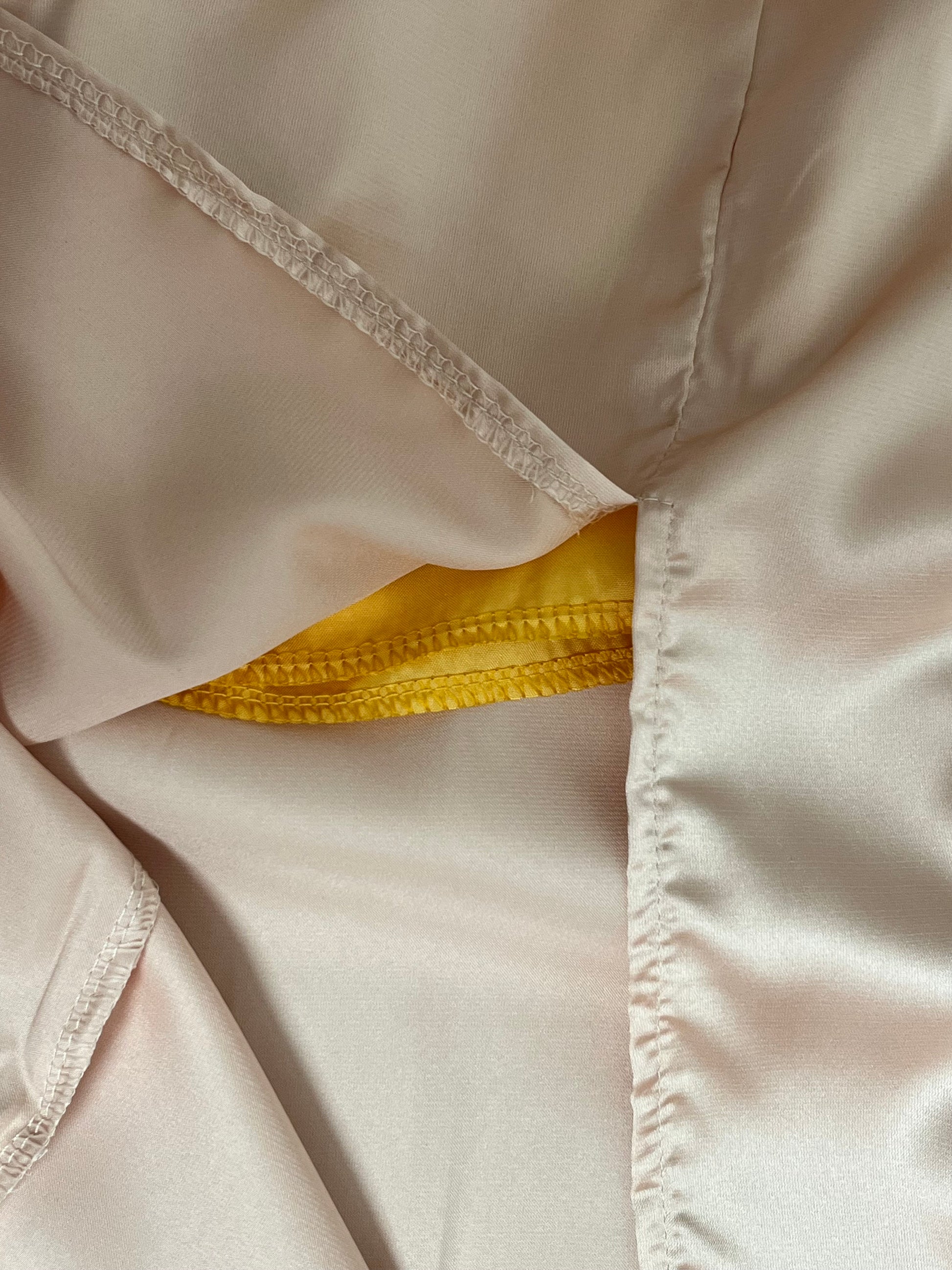 Satin doux et légèrement texturé, doublé, avec bon maintien au niveau de la poitrine.