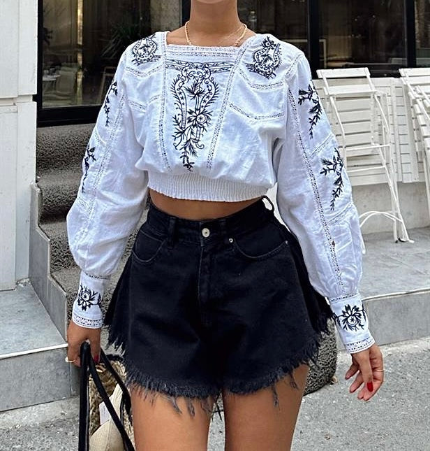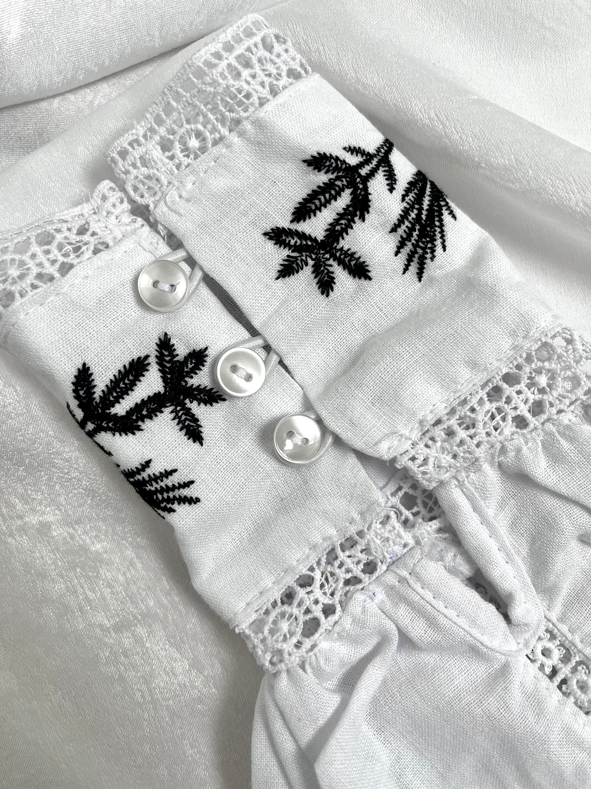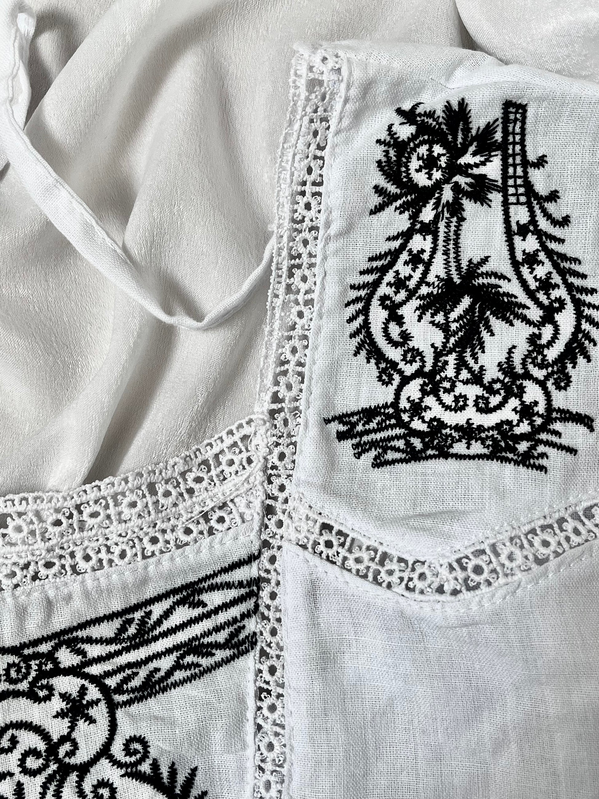 Top Manches Longues Blanc Broderies Noires 100% Coton